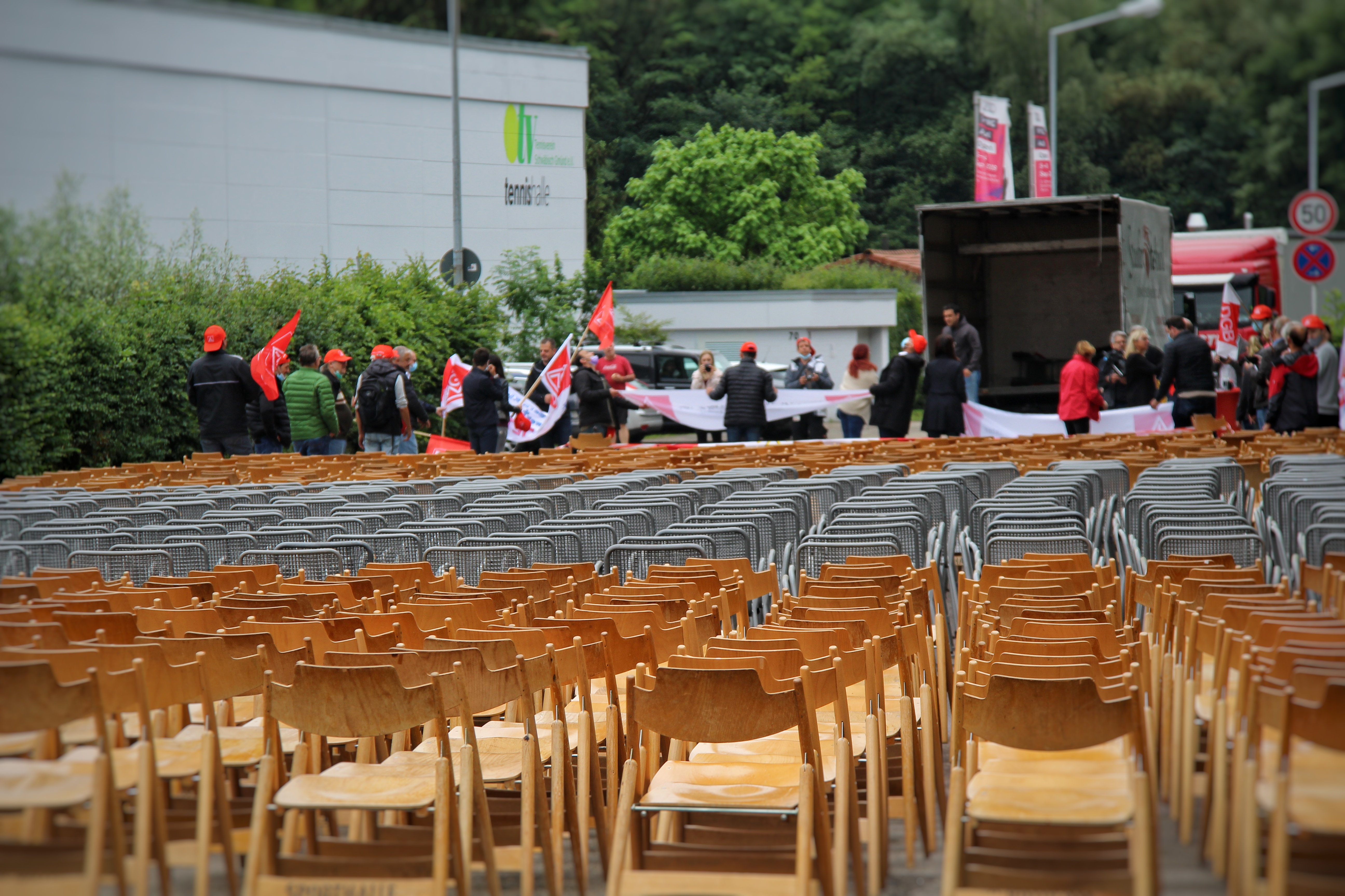 Eine Großveranstaltung? Nein. Die Stühle bleiben leer, wie ein stummer Appell. Sie sind Sinnbild für die 1000 Mitarbeiter die bis 2022 entlassen werden sollen. Ihnen sollen bis 2026 weitere 1100 folgen, so Andrea Sicker, seit April 2020 Erste Bevollmächtigte der IG Metall.