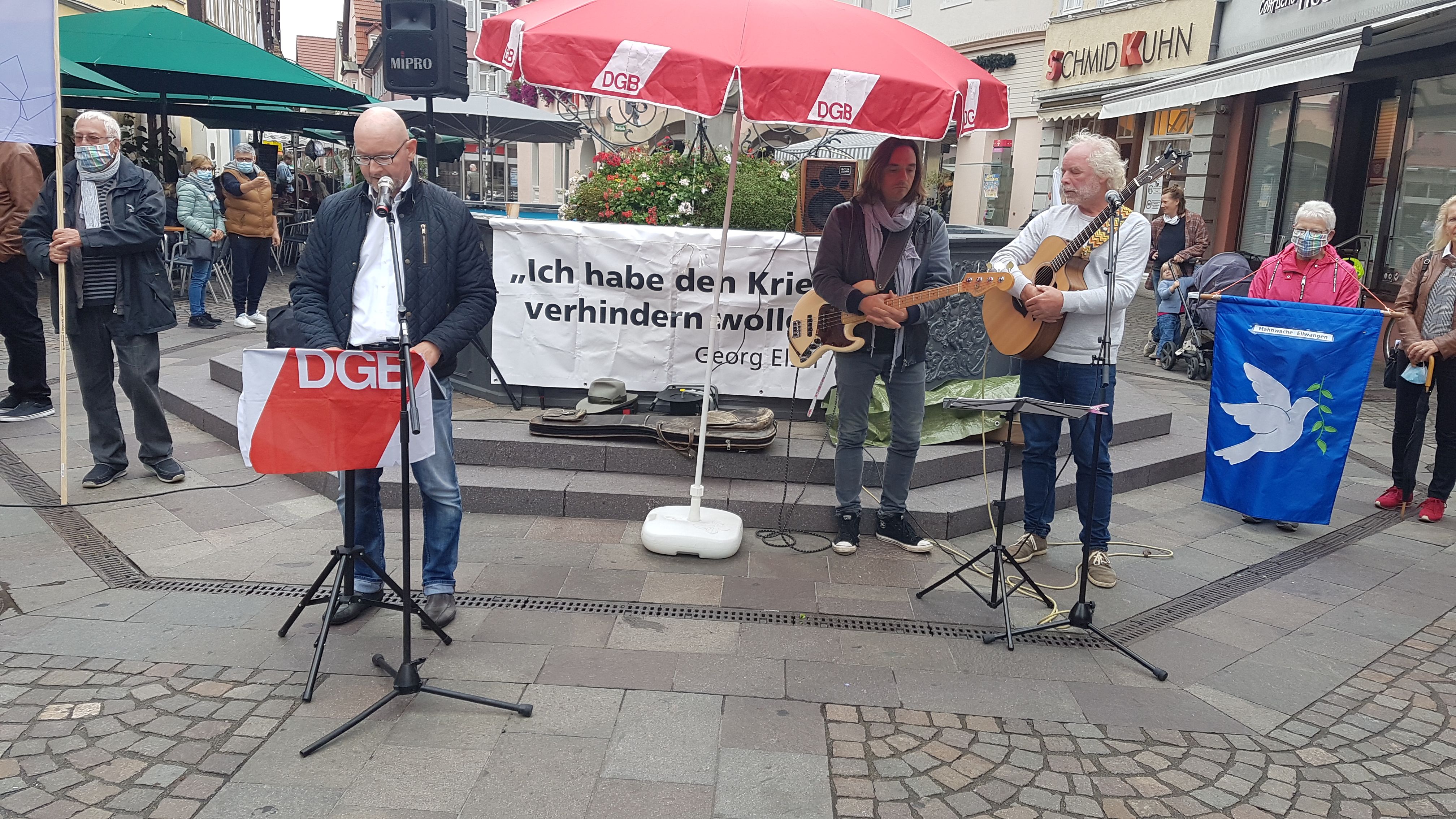 Mit dem Einfall der deutschen Wehrmacht in Polen am 1. September 1939 begann der zweite Weltkrieg. Ein Jahr nach der Einführung der allgemeinen Wehrpflicht 1956 haben sich zunächst Jugendorganisationen und dann der DGB dafür stark gemacht, dass dieser Tag nicht in Vergessenheit gerät. Rund 100 Teilnehmer und Teilnehmerinnen versammelten sich auch dieses Jahr auf Einladung des DGB am Marktbrunnen in Aalen. Die passenden Lieder zwischen den Redebeiträgen steuerten Betriebsseelsorger Rolf Siedler und Markus Braun bei. „Es ist an der Zeit!“ – Hannes Waders Adaption von „No man's land“ hat in diesen angespannten Zeiten nicht an Aktualität eingebüßt.