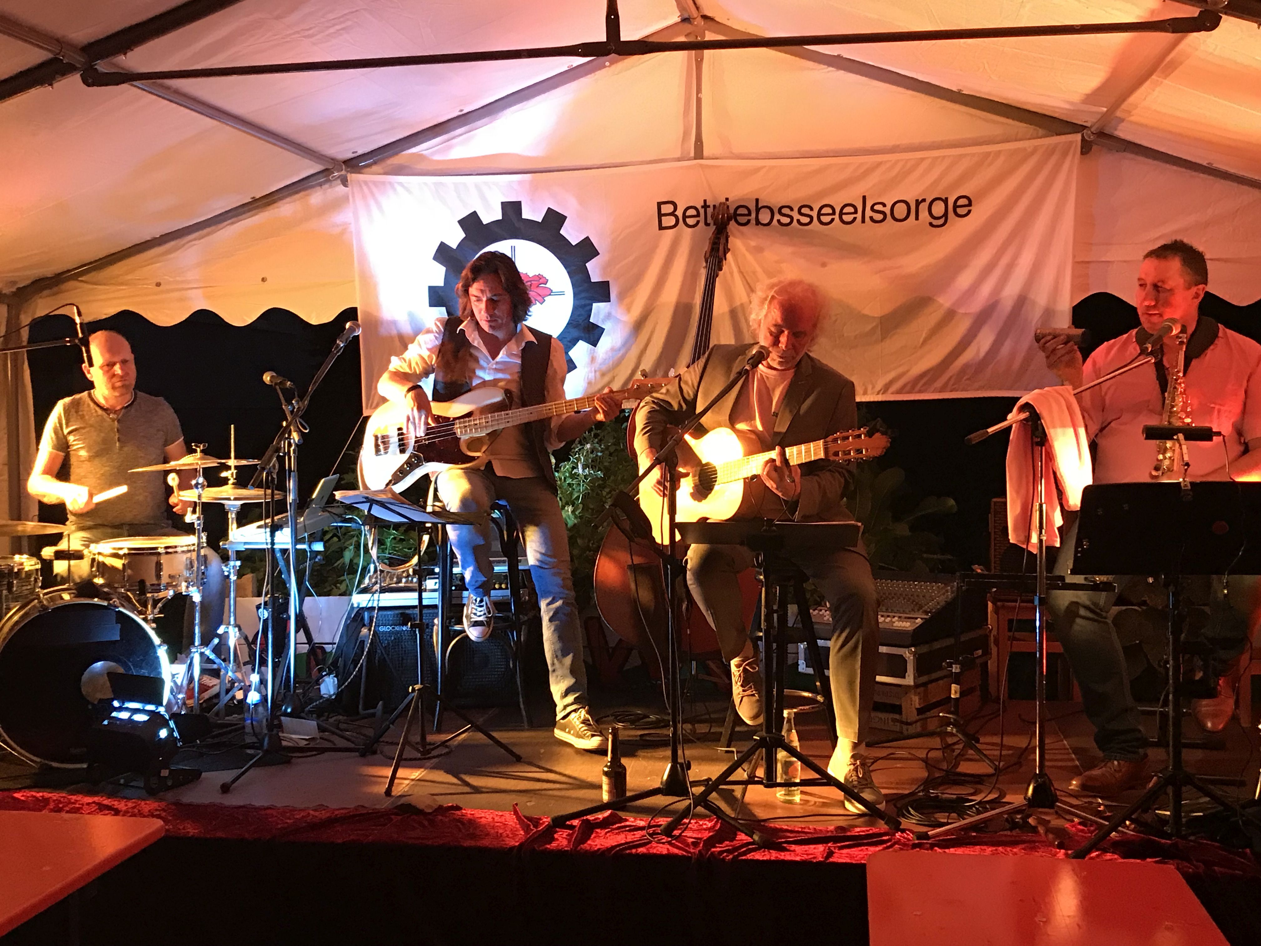 Alle guten Dinge sind … vier. Nach vier Jahren hatten wir endlich einmal richtig fantastisches Sommerwetter. So konnten wir viele alte aber auch neue Bekannte willkommen heißen. Es war ein wunderschöner Abend, die Band trumpfte wieder mit einer gelungenen Mischung aus Salsa, Samba, italienischem so wie deutschem Liedgut auf. Auch Hits von früheren Auftritten wie „Cold , cold ground“ oder der „Folsom Prison Blues“ fehlten nicht. Für eine gelungene Unterbrechung sorgte Martin Kessler mit seinem Versuch dem Publikum beizubringen, was eine Fuge ist. Doch, die Atmosphäre war entspannt vergnüglich, entsprechend war auch die Reaktion des Publikums, die alle fanden, dass das wieder mal ein „Bombenfest“ war.