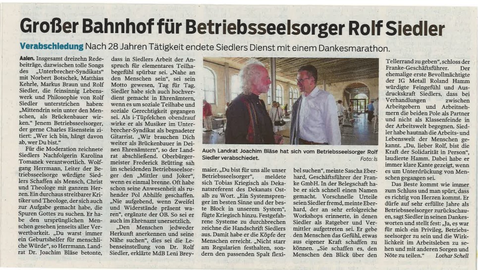 6.10.2022 Großer Bahnhof für Betriebsseelsorger Rolf Siedler Nach 28 Jahren Tätigkeit endete Siedlers Dienst mit einem Dankesmarathon Schwäbische Post Verabsch. Rolf Siedler, Schwäpo Juli 2022.pdf (130.88 KB)
