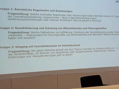 Unter der Fragestellung "Umgamg mit Cannabiskonsum im Betrieb" wurde eine Gruppenarbeit gemacht, um sich über Präventionsstrategien und Umgang mit entsprechenden Vorfällen auszutauschen.