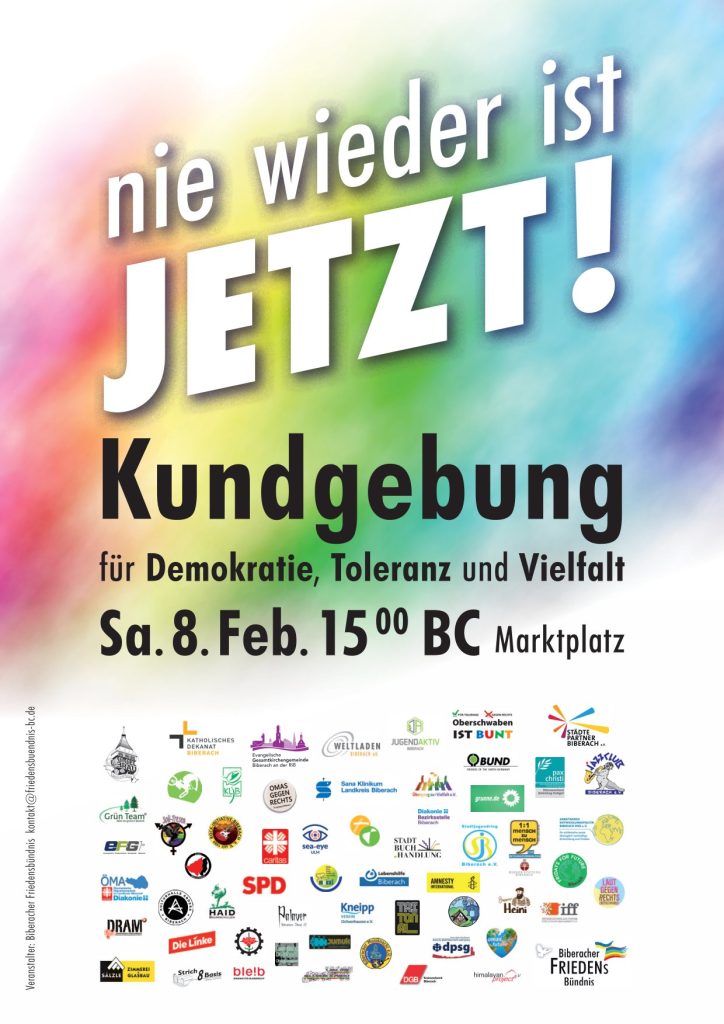 Rund 2000 Menschen haben  am Samstag, 08. Februar 2025 auf dem Marktplatz in Biberach für Vielfalt und gegen Extremismus demonstriert. Das Biberacher Friedensbündnis hat zusammen mit den Kirchen, der Betriebsseelsorge und vielen Vereinen, Einrichtungen und Firmen zu dieser Kundgebung aufgerufen.