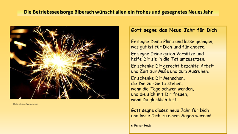 10.1.2022 Neujahrssegen Die Betriebsseelsorge Biberach wünscht allen ein Neues Jahr mit vielen großen und kleinen Sternstunden, glücklichen Momenten und guten Begegnungen sowie weiterhin viel Engagement im Einsatz für eine gerechtere Arbeitswelt! Photo: pixabay Segen: nach Rainer Haak