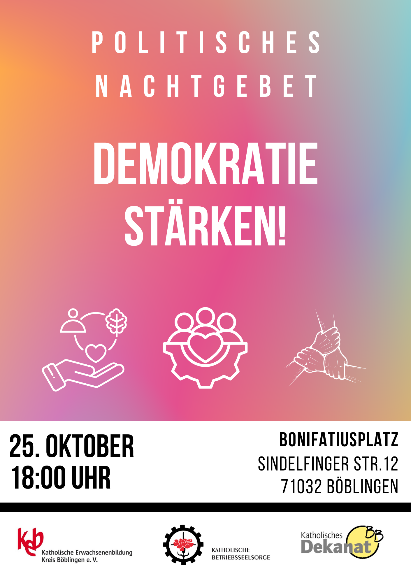 In einer besinnlichen Atmosphäre am Bonifatiusplatz, Sindelfinger Str. 12, Böblingen, werden Impulse zur Frage „Was kann ich zur Demokratie beitragen?“ gegeben. Alle sind herzlich willkommen!