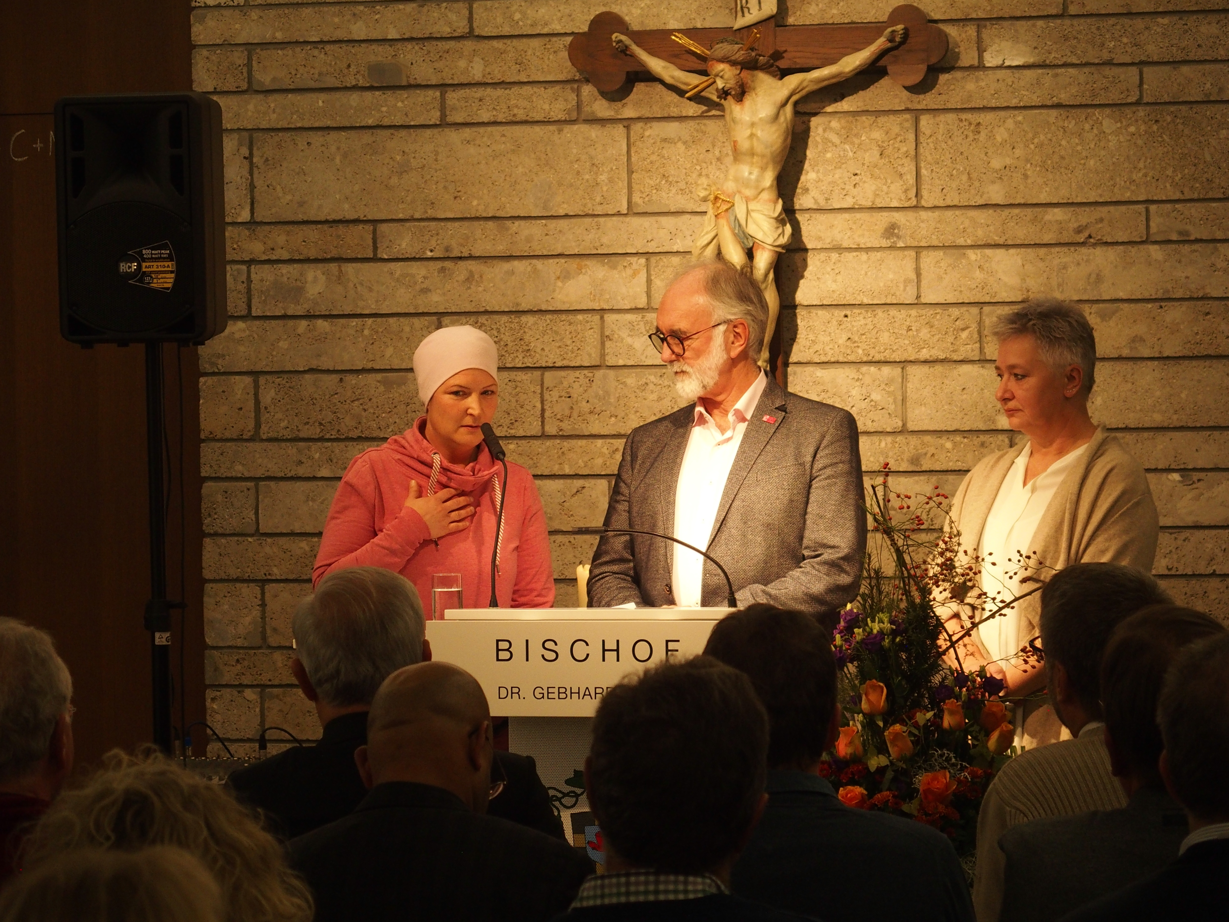 In einer zweiten Gesprächsrunde unterhielt sich Peter Niedergesäß, Diözesansekretär der Katholischen Arbeitnehmerbewegung KAB mit Mitarbeitervertreterinnen aus dem Gesundheitswesen. Jana Langer, Personalrätin an der Uniklinik Ulm und Heike Hagerer, MAV-Vorsitzende im Seniorenzentrum Sankt Anna, Schwäbisch Gmünd illustrierten eindrücklich die Arbeitsbelastungen in der Pflege in ganz unterschiedlichen Einrichtungen. Vielfältige Rückmeldungen von Betriebs- und PersonalrätInnen aus dem Publikum unterstützten die Aussagen: Für eine würdige Pflege braucht es einen Systemwechsel im Gesundheitswesen. Dabei wurde auch von Beschäftigten der Stiftung Liebenau der Ausstieg der Stiftung aus dem kirchlichen Tarif thematisiert und die ausdrückliche Forderung an den Bischof gerichtet: Wir wollen zurück ins kirchliche Tarifrecht!