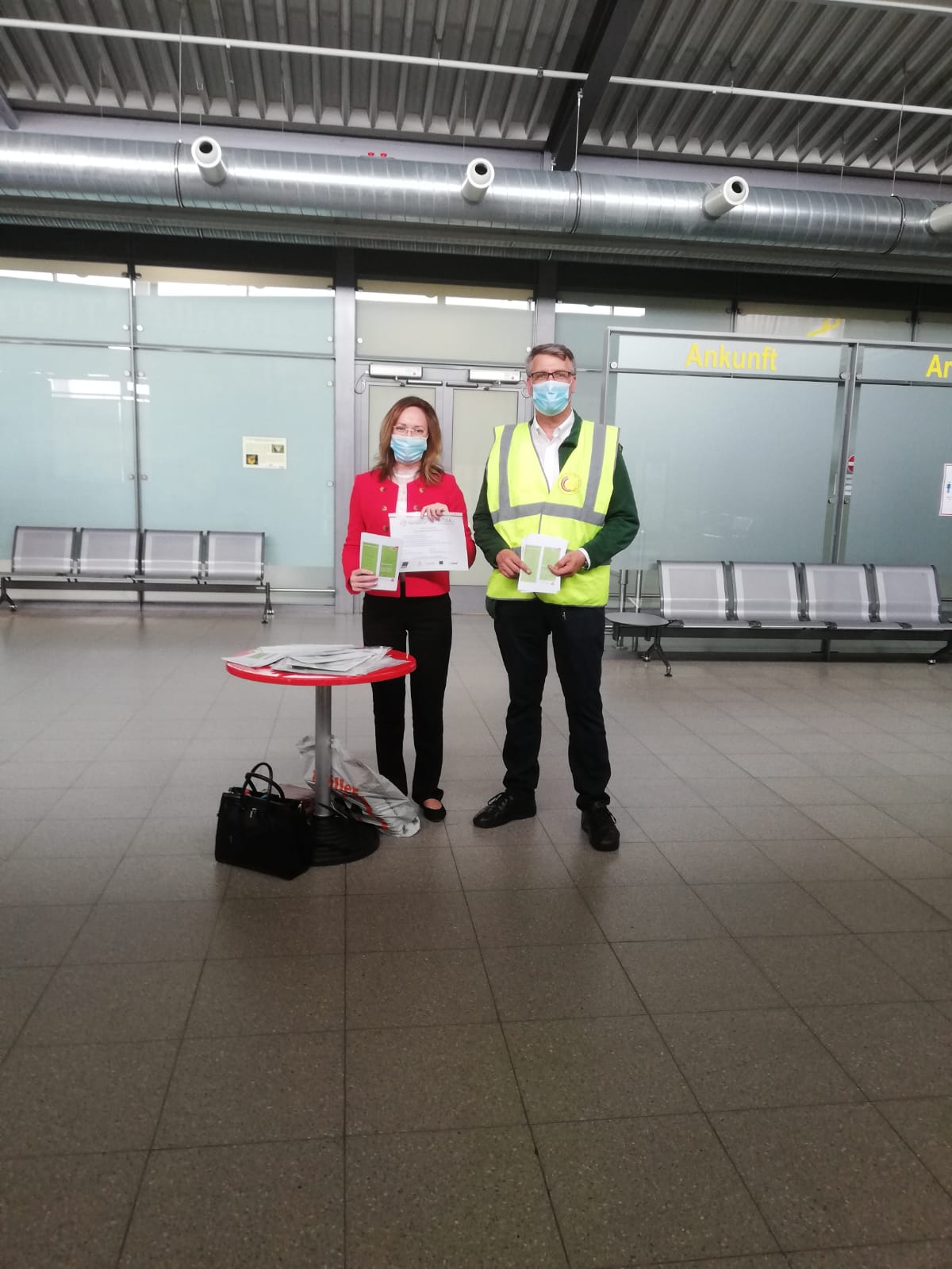 (04.06.2020) Letztmals in diesem Jahr haben Mitarbeitende der Betriebsseelsorge Rottenburg-Stuttgart und des Projekts Faire Mobilität Mannheim (KDA) am Airpark Baden-Baden Erntehelfer*innen aus Sibiu (Rumänien) nach ihrer Landung zu ihren Rechten als Arbeitnehmer*innen in der Landwirtschaft informiert. Die muttersprachlichen Materialien fanden reges Interesse und Abnahme. Darüber hinaus blieb ausreichend Zeit, mit den Abholer*innen, die hauptsächlich im Gemüseanbau tätig sind, über die besonderen Herausforderungen der Umsetzung der Quarantänebestimmungen – sowohl die Unterkunft wie das Arbeiten betreffend – in das Gespräch zu kommen.