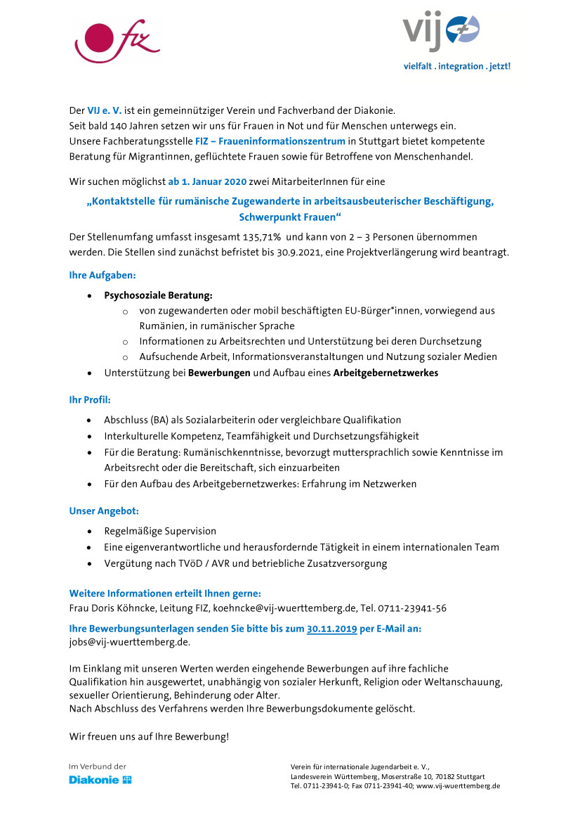 5.12.2019 Rumänisch sprechende Beratung für Menschen in Ausbeutung gesucht Kontaktstelle für rumänische Zugewanderte in ausbeuterischen Beschäftigung, Schwerpunkt Frauen sucht zum 1.1.20 2 Mitarbeiterinnen. Die Stellenausschreibung, siehe unten: Stellenausschreibung FIZ Kontaktstelle Arbeitsausbeutung.pdf (542.69 KB)