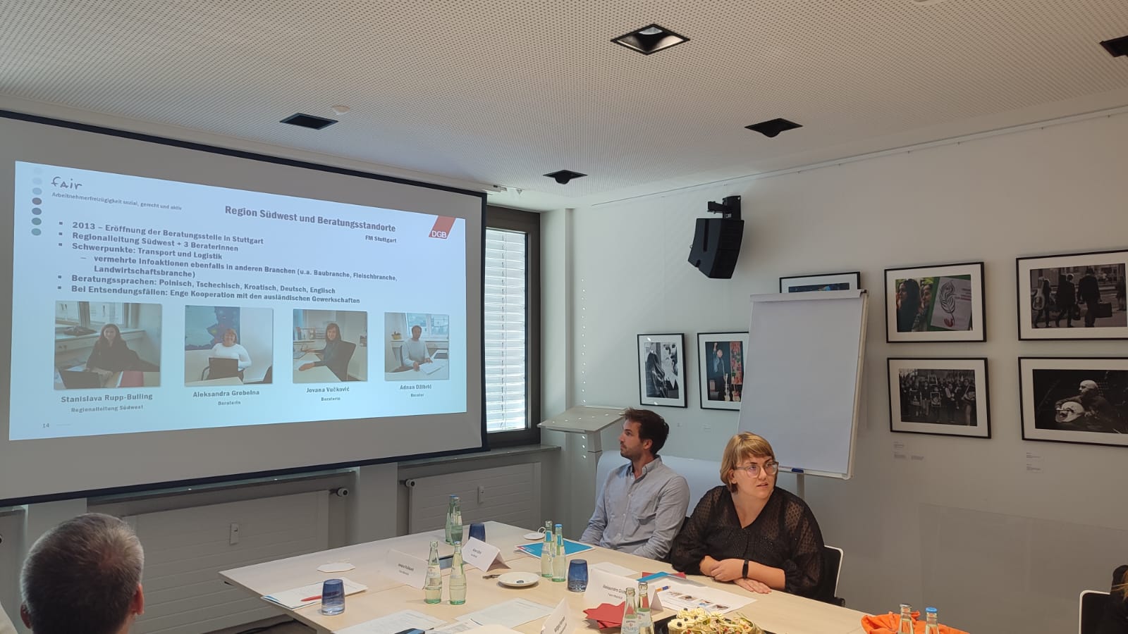 Maren Diebel-Ebers, stellv. Landesvorsitzende des Bezirks DGB Baden-Württemberg und Lars Treusch, Regionsgeschäftsführer DGB Nordbaden, unterstrichen jeweils aus ihrer Perspektive die gelungene Kooperation mit Faire Mobilität, die vor allem in jenen Branchen besonders hohe Relevanz habe, in denen gewerkschaftliche Organisation mobiler Beschäftigter bzw. die Absicherung durch gut ausgestaltete Tarifverträge nicht (mehr) gegeben ist.