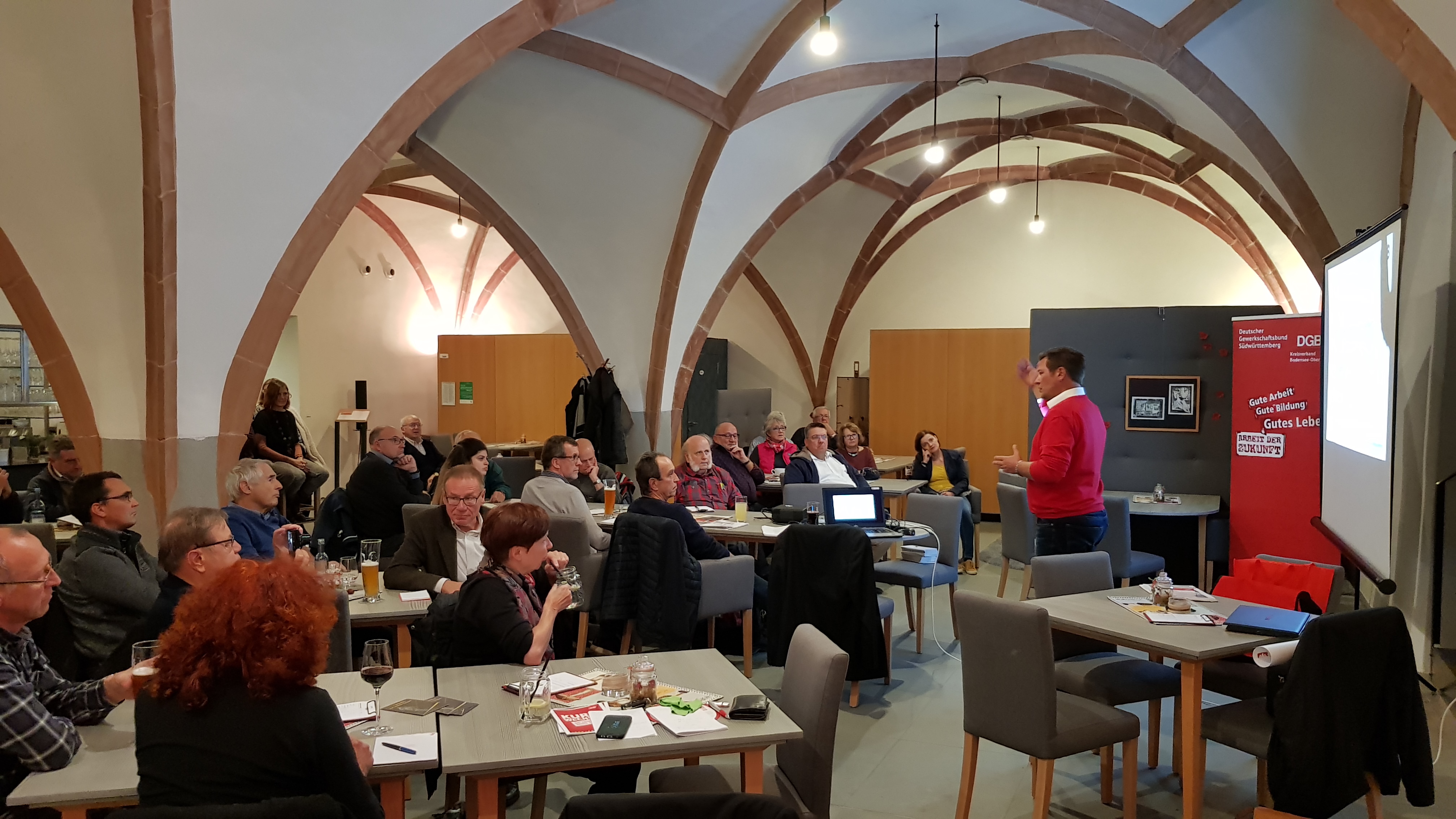 Eine Durchschnittrente in Höhe von 80% des Nettolohnes ist in Österreich Standard. Warum kann sich Deutschland nur 48% erlauben? Zu dieser grundsätzlichen und doch sehr relevanten Frage luden der DGB und die Betriebsseelsorge im Rahmen des Bündnisses gegen Armut den Vorarlberger Christian Pellini ein. 80% Rentenniveau kommen nicht von ungefähr, wird in Österreich doch ein Beitragssatz von 22,8% erhoben, der jedoch von Arbeitnehmerseite nur mit 10,25%, von Arbeitgeberseite jedoch mit 12,55% zu erbringen ist. Das sichert jedoch ein durchschnittliche Rente von 2771.- Euro für männliche Angestellte, während die männlichen Arbeitnehmer sich mit 1858,.- Euro begnügen müssen. Aber immer noch mehr als in Deutschland. Zur Berechnung kommt nicht ein Punktesystem wie in Deutschland, sondern die besten 40 Verdienstjahre werden als Grundlage für die Berechnung genommen. Nachteil gegenüber Deutschland ist, dass es erst mit 45 Beitragsjahren eine volle Rente gibt, wer seine jahre nicht voll bekommt, muss mit Abschlägen bis zu 15% rechnen.