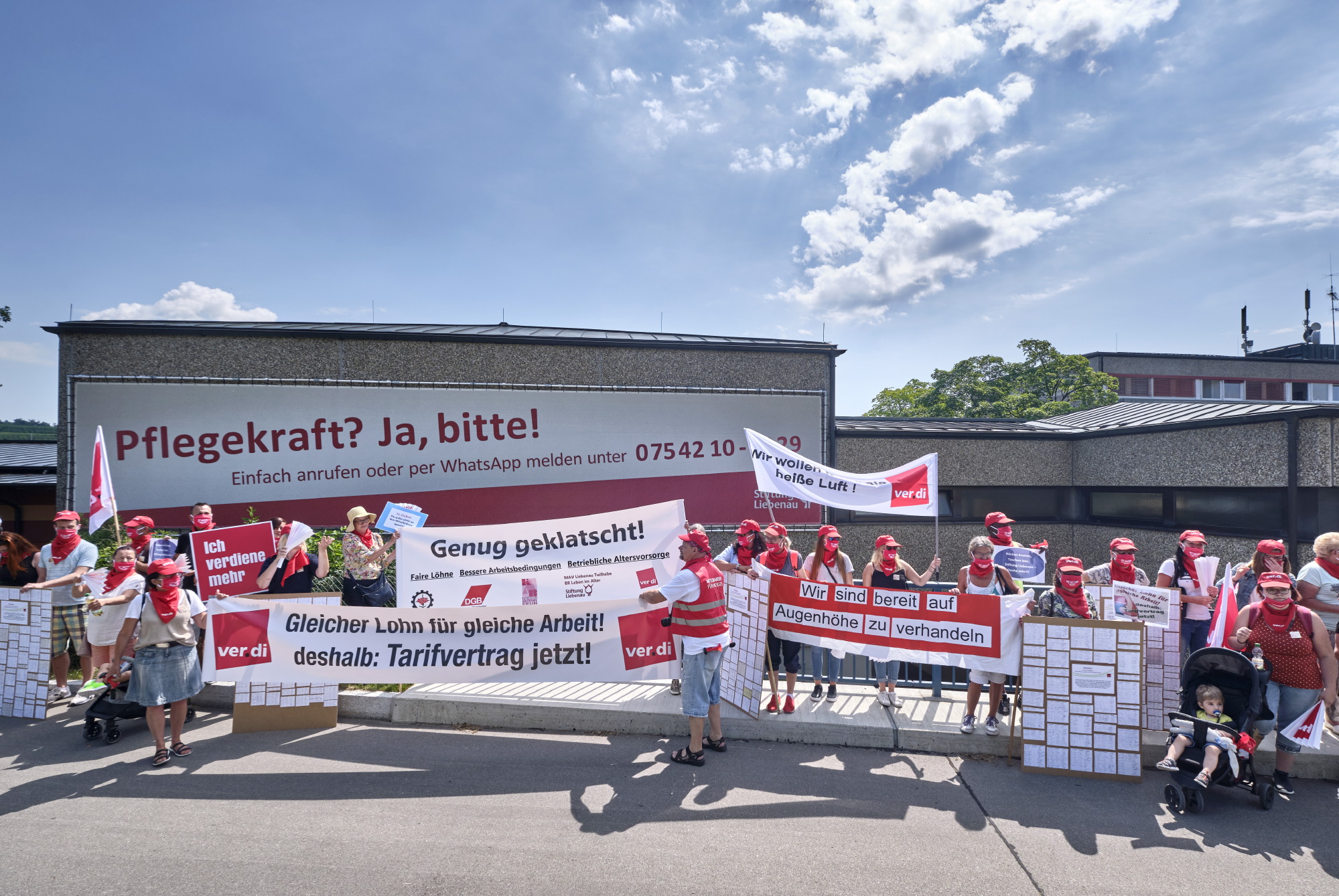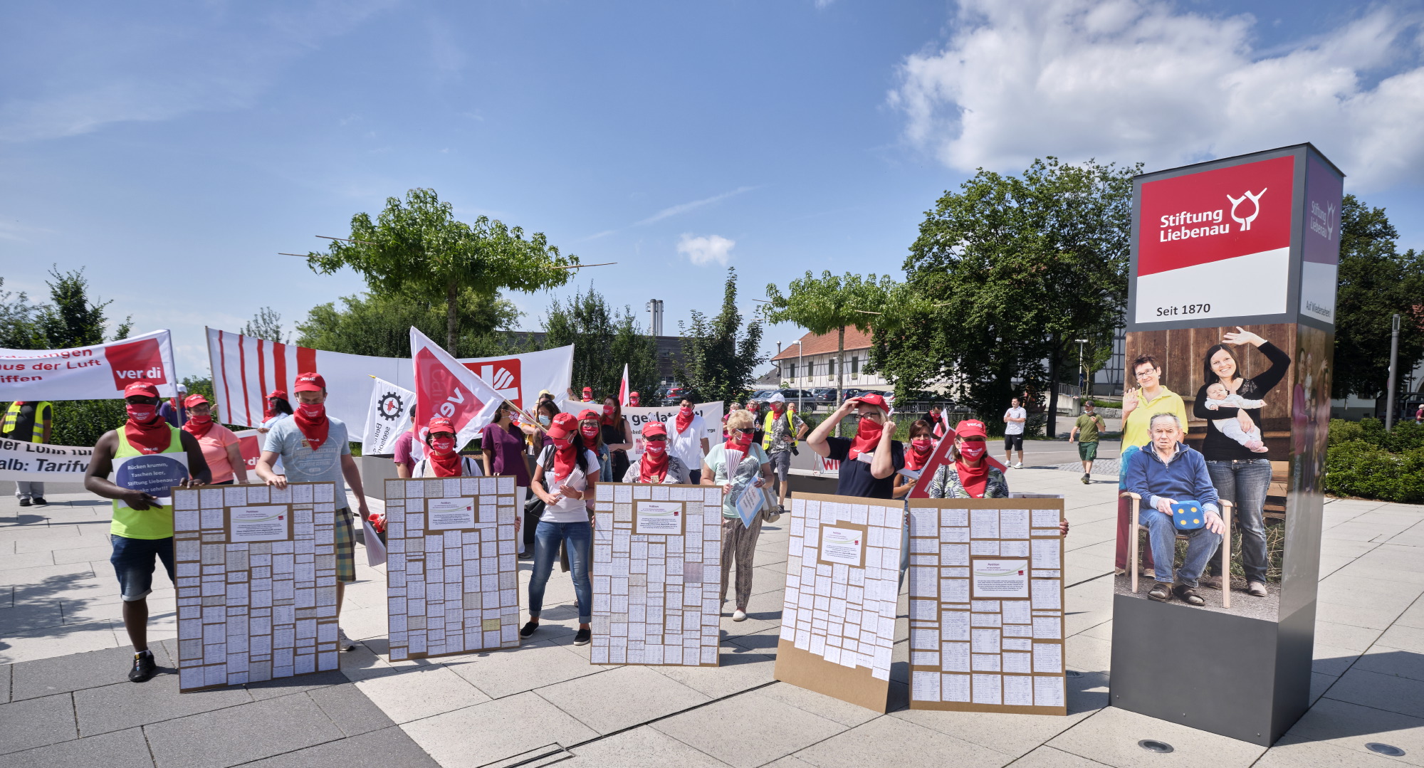 Rund 70 Teilnehmende, darunter Beschäftigte von LiLA, von anderen Liebenauer Einrichtungen, Caritas sowie Betriebsseelsorge und KAB, nahmen an der Kundgebung teil. Mit Plakaten, Transparenten, symbolischen Unterschriften und viel Lärm wurde auf die Missstände im Bereich LiLA aufmerksam gemacht. Verdi-Verhandlungsführerin Yvonne Baumann setzte klare Maßstäbe, indem sie von Geschäftsleitung und Vorstand fordert, am Freitag zu erklären, in welche Richtung weiter verhandelt werden kann – besteht Interesse an Verbesserungen oder will Liebenau auf dem derzeitigen Stand bleiben.