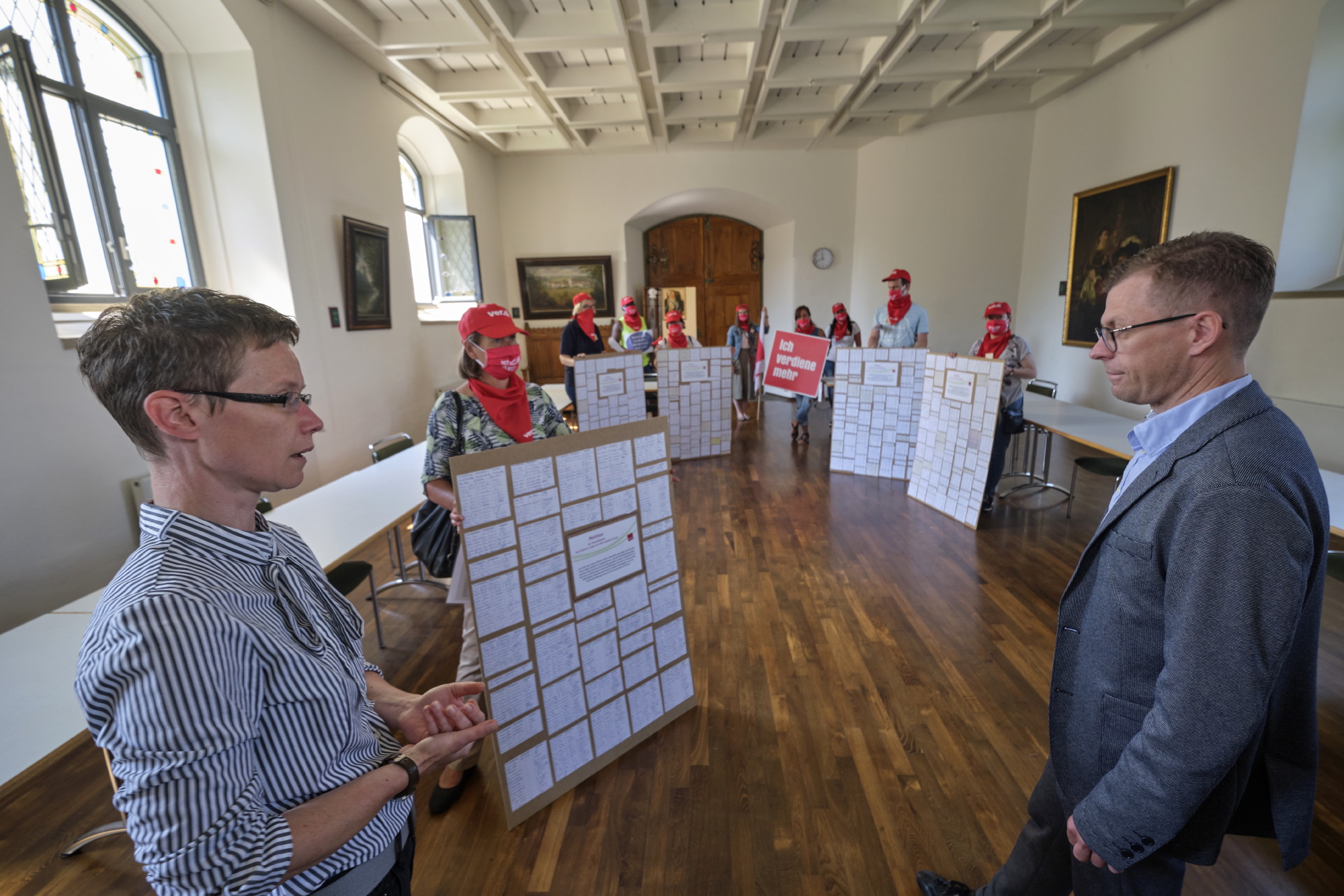 Werner Langenbacher beglückwünschte die Demonstrierenden zu dieser Aktion, die angesichts von Abstandsregeln ein starkes Zeichen setzt. Er fordert von der Kirchlichen Einrichtung Liebenau die Anwendung des Sozialprinzips der Solidarität: zum einen mit den Beschäftigten, die oft an die Grenzen ihrer Leistung gehen, zum anderen die Mitfinanzierung von LiLA durch andere gewinnbringende Geschäftsbereiche der Stiftung. KAB Sekretärin Andrea Grabherr lud die Anwesenden ein, sich an der Petition für Gute Pflege zu beteiligen, was viele mit ihrer Unterschrift unterstützten.
