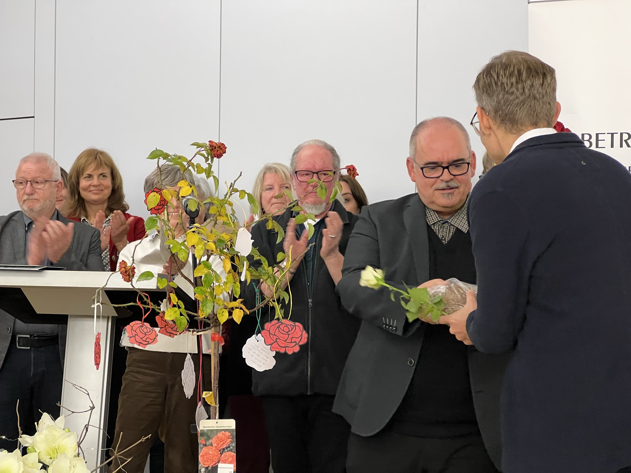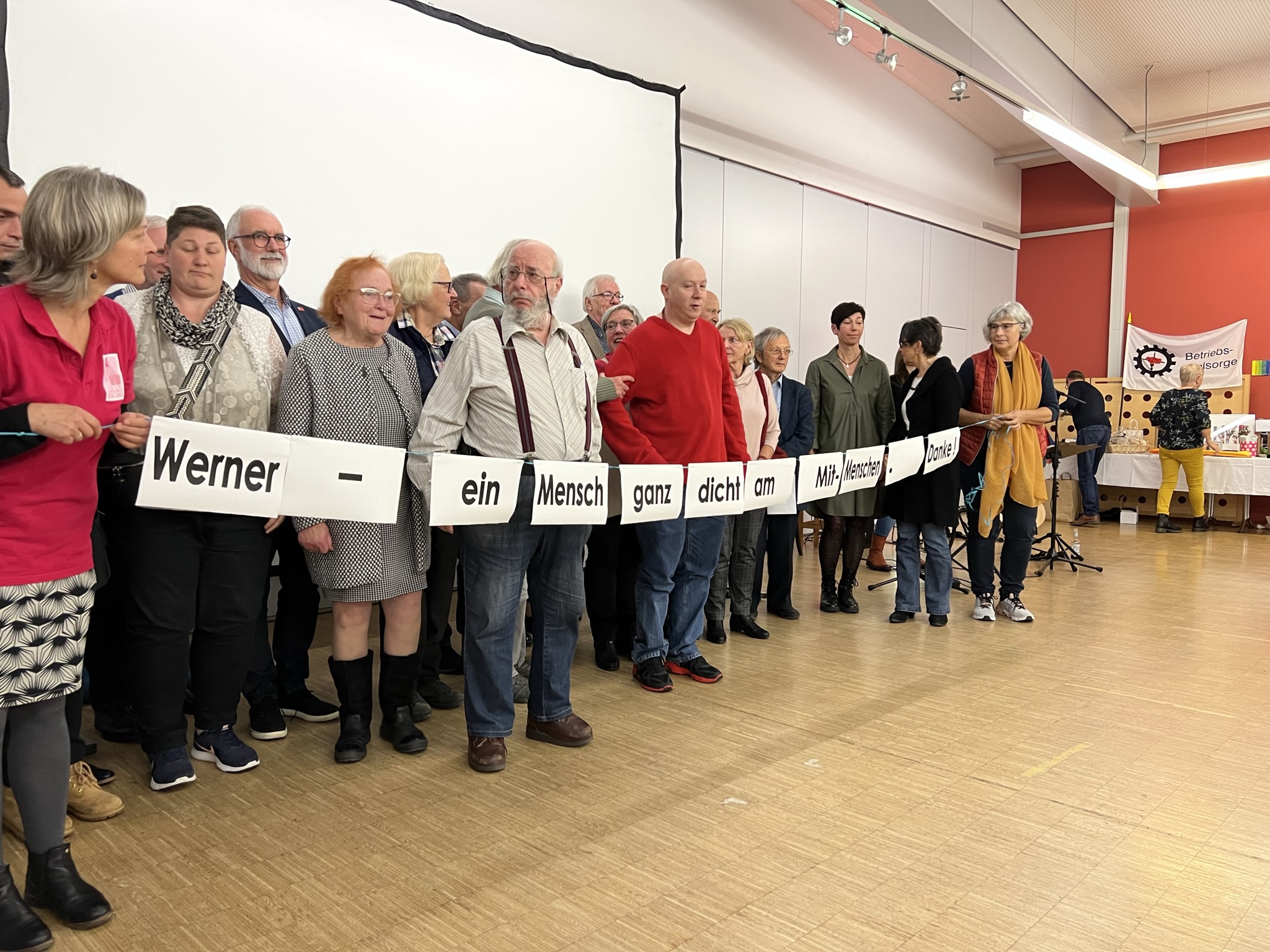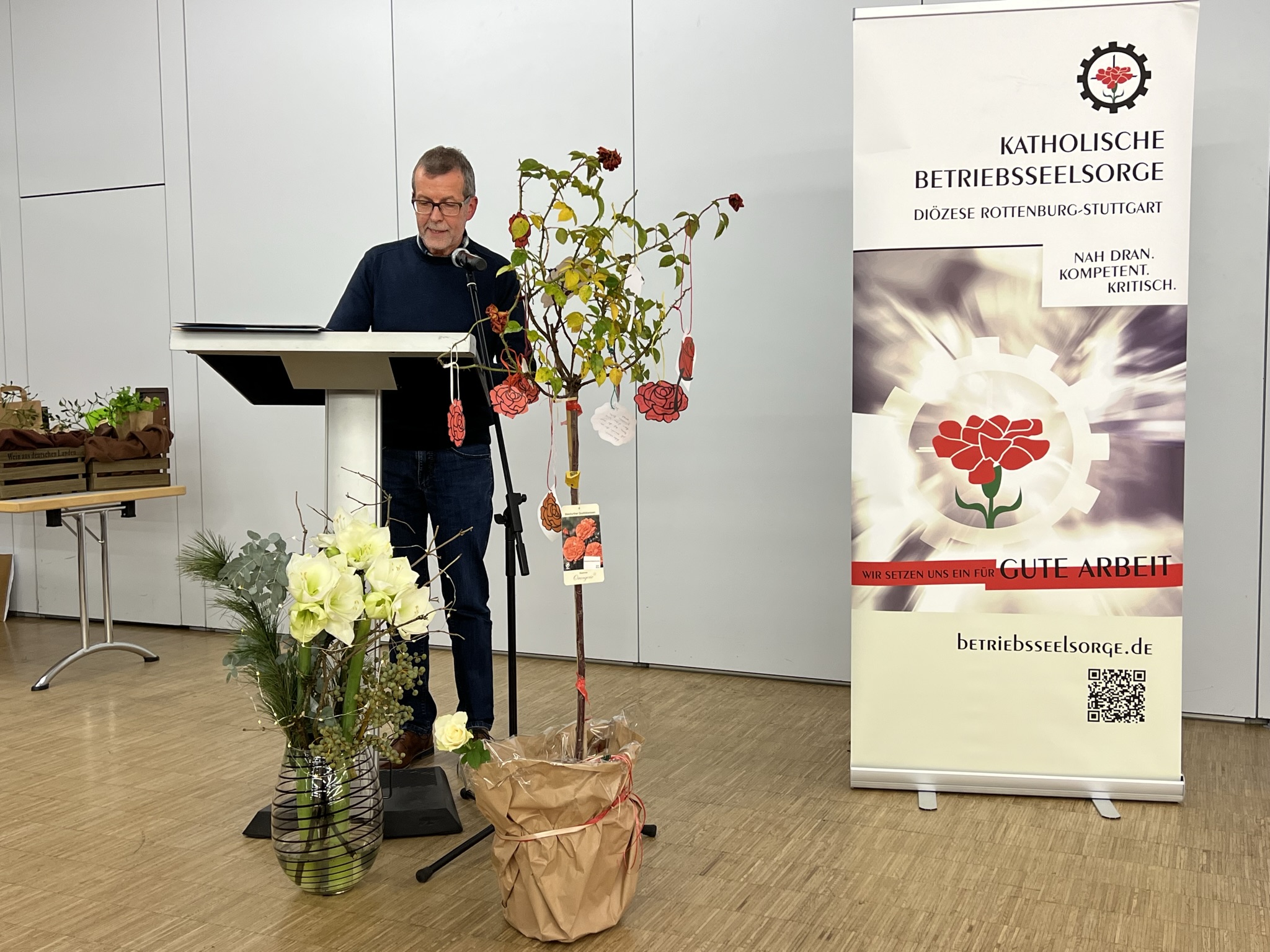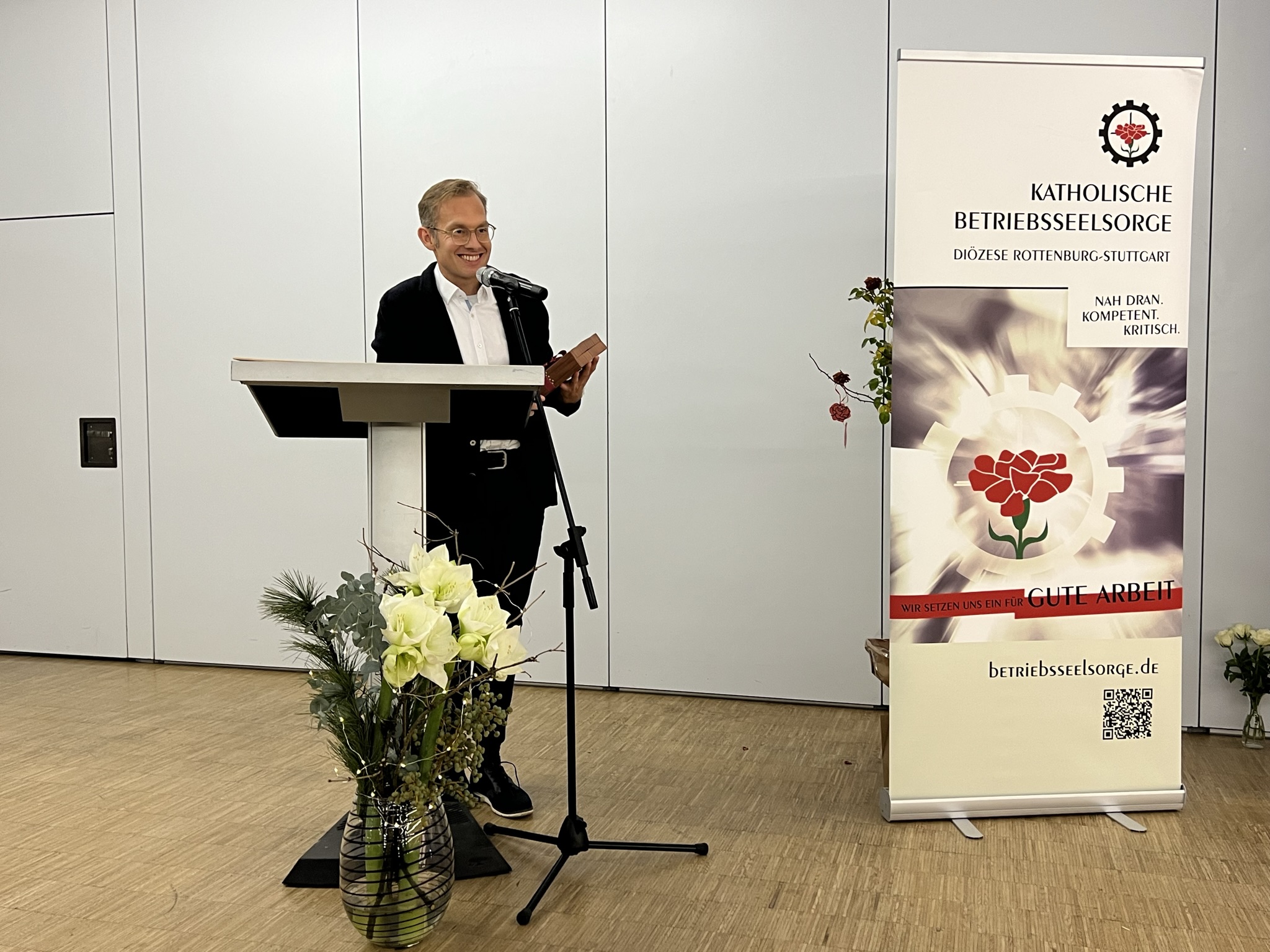 Advent 2022 - Wir müssen nicht mehr warten, er ist schon angekommen, der neue Betriebsseelsorger für die Region Bodensee-Oberschwaben mit Sitz in Ravensburg. Am 1. Dezember übernimmt Philipp Groll die Leitung der regionalen Betriebsseelsorge, nachdem er im November bereits mit Werner Langenbacher ständig unterwegs war. Am Freitag, 25.November, fand ein großes Fest der Übergabe statt, bei dem der bisherige Betriebsseelsorger auf eine sinnerfüllte Zeit zurück schauen konnte. 29 Jahre lang war er in den Landkreisen Ravensburg und Bodensee in Betrieben unterwegs, bildete Netzwerke und Bündnisse, beriet und begleitete Menschen in schwierigen betrieblichen Situationen und erhob öffentlich die Stimme, wenn es um Gerechtigkeit und Solidarität ging. Zusammen mit Gewerkschaften, der KAB (Katholische Arbeitnehmer*innen Bewegung), Sozialverbänden, Einrichtungen und Verbänden wies er stets auf Menschen, die durch das gesellschaftliche Raster fallen und an den Rand gedrängt werden, sei es durch Arbeitslosigkeit oder geringem Einkommen. In letzter Zeit wurde er in der Öffentlichkeit durch seinen Einsatz für georgische Erntehelfer wahrgenommen, da diese in der Bezahlung und Unterkunft ausgebeutet wurden. Durch seinen Einsatz fassten die Erntehelfer*innen den Mut, ihre Rechte vor dem Arbeitsgericht einzuklagen. Betriebsseelsorge ist kein Job, sondern Berufung, wie Langenbacher sagt. Er ist auch der Kirchenleitung dankbar, dass er diese Aufgabe selbstbestimmt und sinnstiftend ausüben konnte, besonders auch für die sechswöchigen Betriebseinsätze in unterschiedlichen Branchen, die er alle paar Jahre durchführen konnte. Zum Gelingen seiner Arbeit hat auch das Team in Ravensburg beigetragen, nur mit ihnen und ihrer Unterstützung konnte die Arbeit geleistet werden. „Das was ich heute bin, bin ich nur durch euch und mit euch“, so Langenbacher bei seinem Abschied. Dem ist nichts hinzuzufügen.