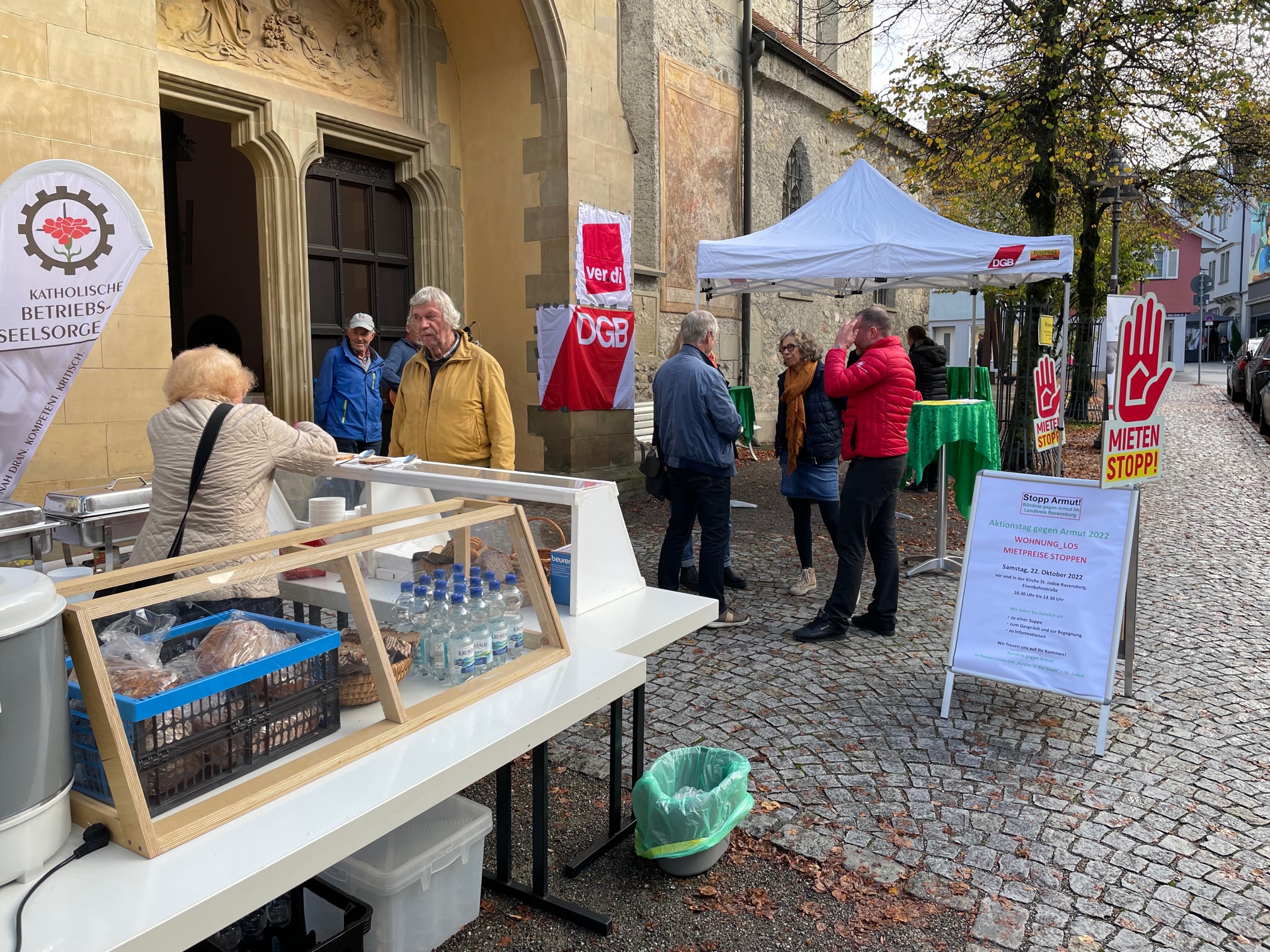 Zu Suppe und Erfahrungsaustausch haben die Mitglieder des Bündnisses gegen Armut im Landkreis eingeladen, die sich vor der Kirche St. Jodok in Kooperation mit der Stadtkirche platzierten. Viele nahmen die Einladung zu einer kostenlosen Kürbissuppe an und berichteten über ihre Erfahrung mit Armut und ihrer Suche nach bezahlbarem Wohnraum. Das Bündnis hat in diesem Jahr den Tag gegen Armut unter das Thema „Wohnung_Los - Miietpreise stoppen“ gestellt. Nicht nur in Ballungsgebieten, auch im wirtschaftsstarken Oberschwaben fehlen für Menschen mit geringem Einkommen menschenwürdige Wohnmöglichkeiten. Abhilfe kann jedoch nur in einer konzertierten Aktion von Politik, Gesellschaft und Wohneigentümern geschaffen werden, da nach Meinung einiger Passanten es in Ravensburg immer noch genügend leerstehende Wohnungen gibt. Das Bündnis fordert neben der finanziellen Besserstellung von Menschen in Armut zudem auch die Möglichkeit der gesellschaftlichen Teilhabe, besonders für Familien, Frauen und junge Menschen.