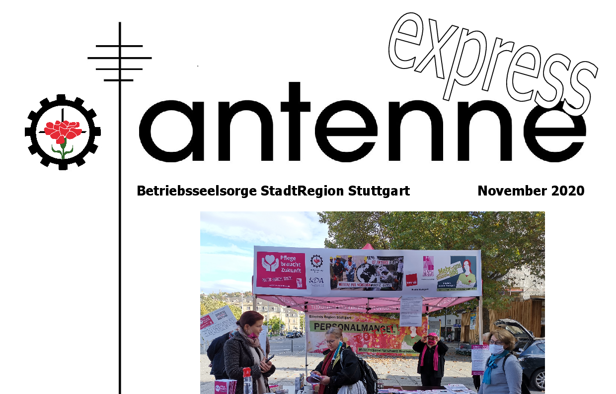 Antenne 7.12.2020 “antenne express November 2020 online“ "antenne express November 2020" Themen - Tag der Menschenwürdigen Arbeit 2020: Pflegeberufe - Karstadt/Kaufhof: Gut gekämpft - trotzdem geschlossen - Wir sind da - kreative Lösungen in der Erwerbslosenseelsorge Antenne express November 2020.pdf (4.31 MB) "antenne express November 2020"