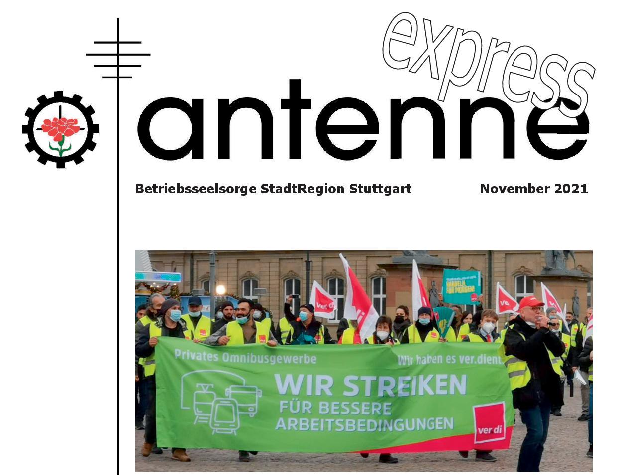 Antenne 7.12.2021 "antenne express November 2021 online" Themen - Streiktag im Omnibusgewerbe - Neuigkeiten aus dem Team der Betriebsseelsorge Stuttgart - Alles neu - Der Mittwochstreff lebt auf antenne express November 2021.pdf (3.26 MB)
