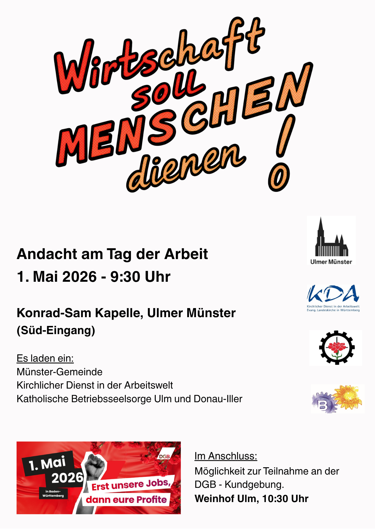 Ulm 1. Mai 2026 09:30 - 10:30 Andacht am Tag der Arbeit ! Andacht am Tag der Arbeit! 1. Mai 2026 - 9:30 Uhr Konrad-Sam Kapelle, Ulmer Münster (Süd-Eingang) Es laden ein: Münster-Gemeinde Kirchlicher Dienst in der Arbeitswelt Katholische Betriebsseelsorge Ulm und Donau-Iller DGB_1. Mai 2026 INSTAGRAM: BS Ulm