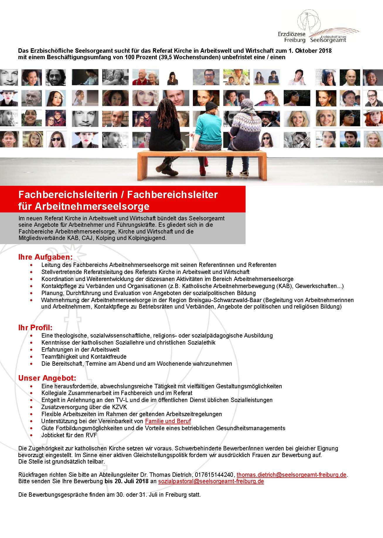 In der Erzdiözese Freiburg sind im Referat Kirche in Wirtschaft und Arbeitswelt mit Stellenantritt 1. Oktober 2018 zwei Stellen neu zu besetzen. Ausgeschrieben ist die Stelle des/der Fachbereichsleiter*in für Arbeitnehmerseelsorge in Freiburg sowie die eines/einer Referent*in für Arbeitnehmerseesorge in der Diözesanstelle Hochrhein mit Sitz in Waldshut-Tiengen.